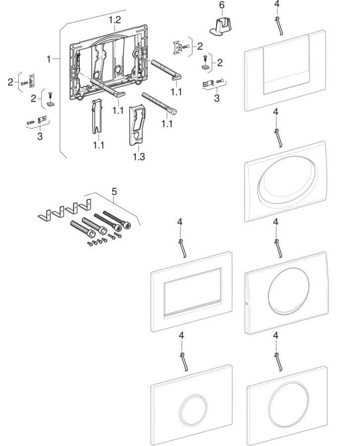 zur Spülauslösung bei Sigma UP-Spülkästen, Betätigung von vorne, Drückerstangen schallgedämmt, werkzeuglose Schnelleinstellung, Betätigungskraft < 20 N, bestehend aus Befestigungsrahmen, 2x Distanzbolzen, Drückerstange und Unterbrechungshebel