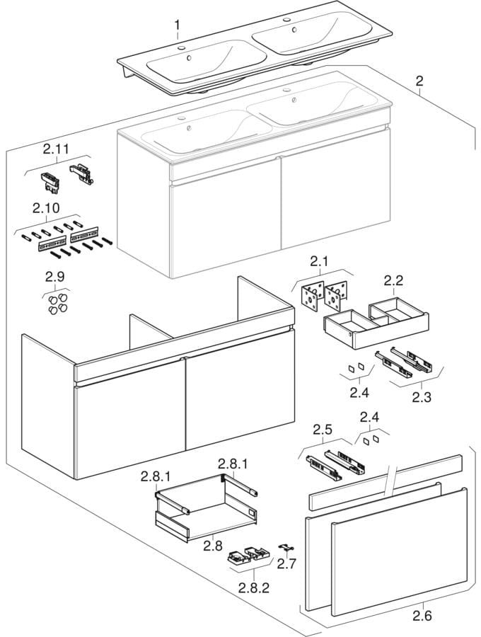Geberit Doppelwaschtisch-Set Renova Plan 130x62,2x48cm, Korpus/Front weiß hochglänzend, Waschtisch weiß W35849