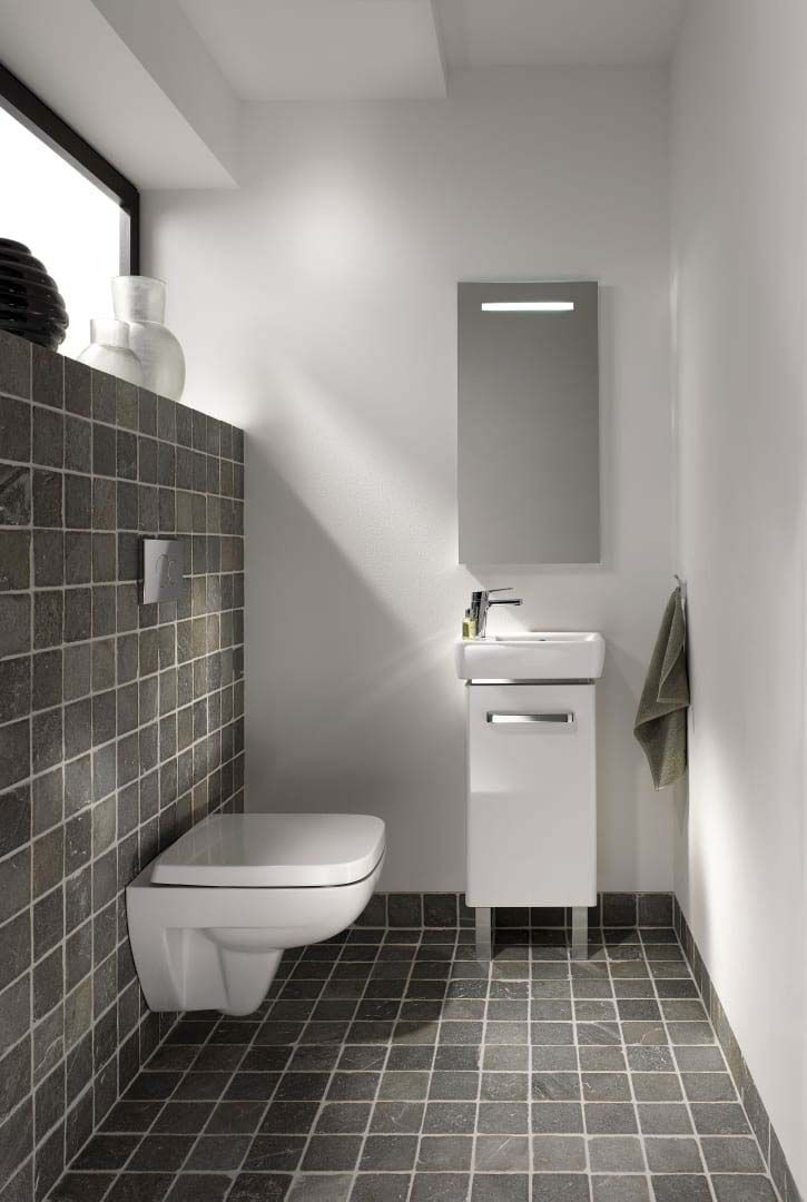 ohne Ablagefläche, verkürzte Ausladung, zum Einbau in kleinen Badezimmern und Gäste-WCs geeignet, unterbaufähig, asymmetrisch, aus Sanitärkeramik, kombinierbar mit Renova Compact Unterschrank für Handwaschbecken, mit Tür