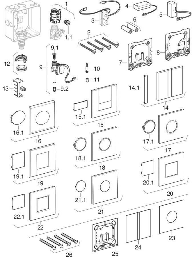 zur automatischen Spülauslösung von Urinalen, für Montageelemente für Urinal mit Betätigung von vorne, zum Einbau in Rohbausets für Urinalsteuerungen (ab Baujahr 2009), Abdeckplatte mit Sicherungsriegel, sichere IR-Distanzerkennung, IR-Sensor selbsteinstellend, wassersparender Hybridmodus einstellbar, Spülzeit manuell einstellbar, dynamische Spülzeitanpassung, Vorspülung einstellbar, auf Betrieb mit Deckelurinal umstellbar, Stromversorgung durch Netzanschluss, Netzteil mit LED-Anzeige, Ventilschließfunktion bei Netzausfall, Funktionen mit Service-Handy einstellbar und abfragbar, Spülauslösung über Clean-Handy deaktivierbar, Spülmenge über Drosselschraube des Rohbausets bis auf 0,5 l pro Spülung reduzierbar, Armaturengruppe II nach DIN 4109, Schutzart IP45, Nennspannung 110-240 V AC, Netzfrequenz 50-60 Hz, Betriebsspannung 4,5 V DC, Leistungsaufnahme < 0,5 W, Fließdruck 100-800 kPa, Mindestfließdruck 100 kPa, max. Prüfdruck Wasser 1600 kPa, max. Prüfdruck Luft/Inertgas 300 kPa, relative Luftfeuchte < 100 %, max. Wassertemperatur 30 °C, Durchfluss bei 100 kPa ohne Durchflussbegrenzer 0,3 l/s, Durchfluss bei 100 kPa mit Durchflussbegrenzer 0,24 l/s, Berechnungsdurchfluss 0,3 l/s, Intervallspülung Einstellbereich 1-168 h, Intervallspülung Werkseinstellung 24 h, Intervallspülzeit Einstellbereich 3-180 s, Verweilzeit Einstellbereich 3-15 s, Verweilzeit Werkseinstellung 7 s, Spülzeit Einstellbereich 1-15 s, Spülzeit Werkseinstellung 4 s, bestehend aus Abdeckplatte Typ 01, mit IR-Fenster, Befestigungsrahmen, Infrarotsteuerung, vormontiert auf Befestigungsrahmen, Magnetventil, Netzteil, Befestigungsmaterial