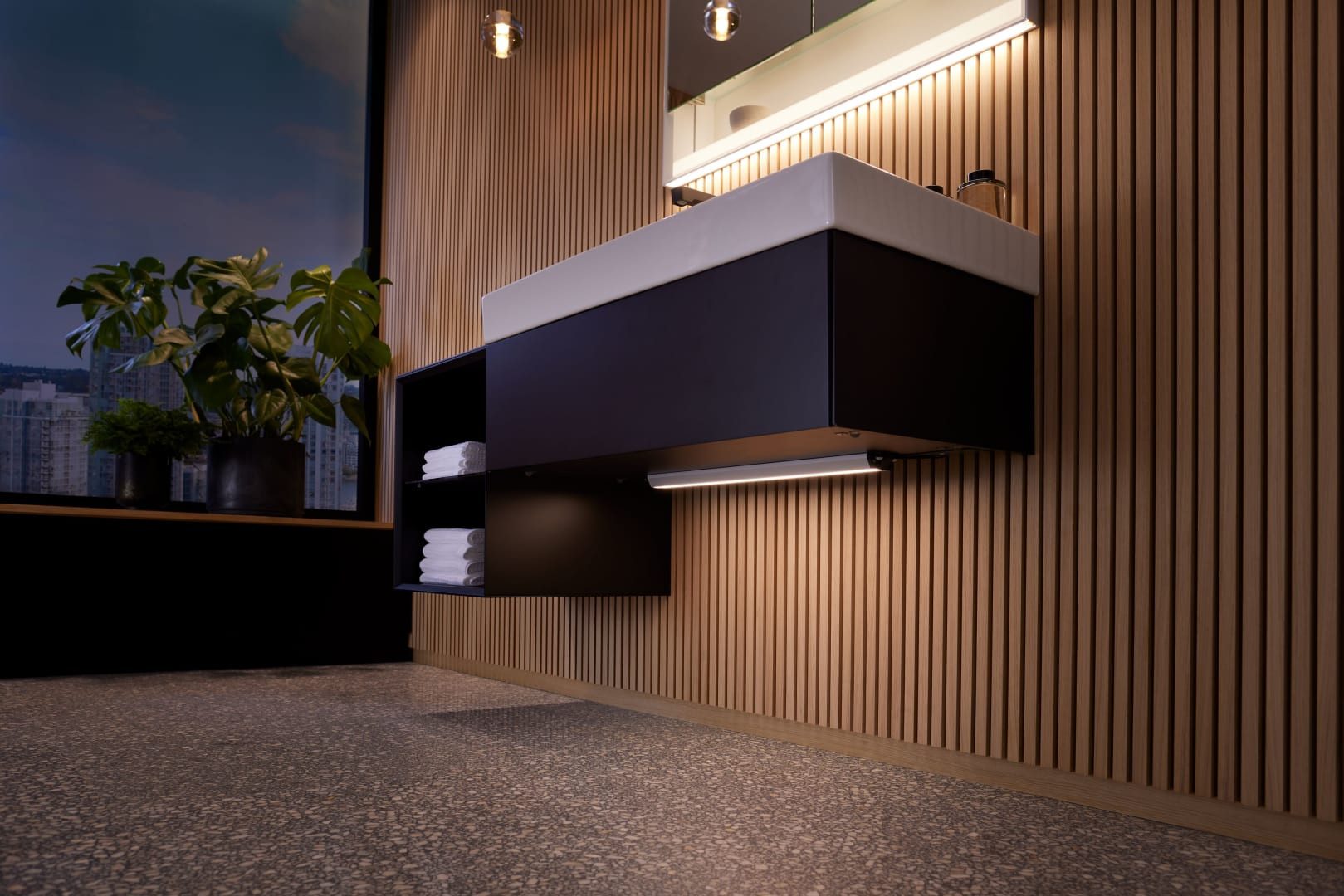 für Icon, Acanto und ONE Waschtischunterschränke in Kombination mit ONE Spiegelschränken mit ComfortLight, Vernetzung über DALI-Bus, stufenlos einstellbare Lichtstimmung von Orientierungslicht bis Tageslicht, indirekte Beleuchtung, LED-Beleuchtung, mit Steckdose in oberer Schublade, Anschlussklemme für Draht, 1,5 mm², Schutzart IP 20, 230 V AC, 50 Hz, Lichtfarbe 2200-4000 K, Steckdose CEE 7/4