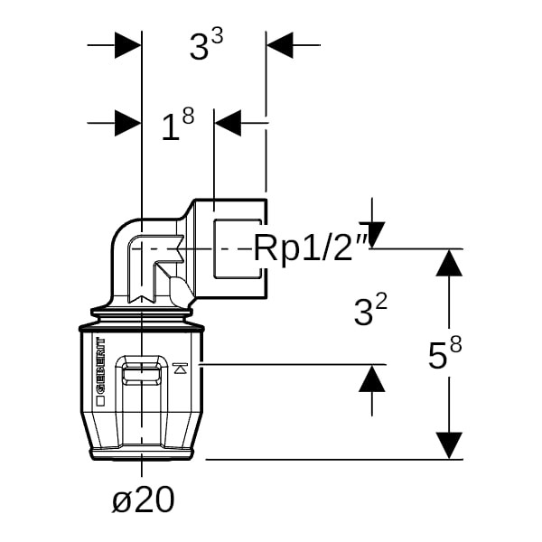 Geberit Übergangswinkel PushFit Ø 20 mm x Rp 1/2, 90Grad, mit Innengewinde, Messing