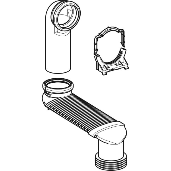 zum Anschließen von Wand-WCs und Stand-WCs an Bodenabläufe, bestehend aus Anschlussstutzen aus PE-HD, Ø 90 mm, Versprungbogen aus ABS, Ø 90 mm, Rohrschelle, Manschette aus EPDM, Ø 90/110 mm, Klebstoff