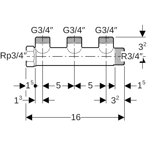 Geberit Verteiler R 3/4 x G 3/4, 3-fach, mit Gewindeanschluss, Rotguss