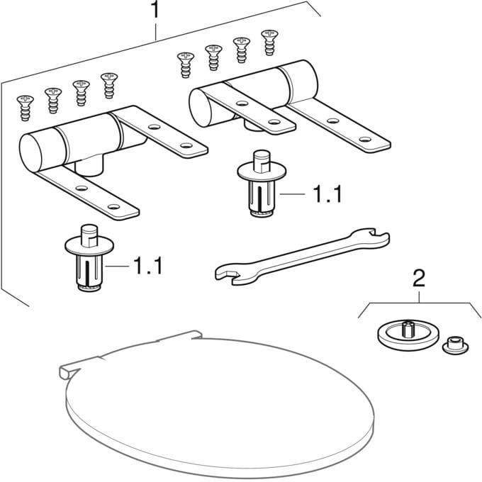 | Scharnierfussbefestigung am Sitz mit | in den Deckel gesteckte Stifte |