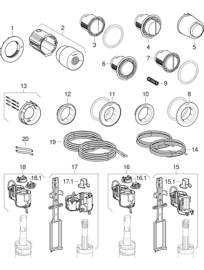 für Badmöbel, aus Kunststoff, zur Montage als Möbeldrücker, für Sigma, Omega und Delta UP-Spülkästen 12 cm und AP-Spülkästen AP140, für Kappa UP-Spülkästen 15 cm, Bauform rund, Drücker aus Kunststoff, mit Betätigungsplatten für 1-Mengen-Spülung und Spül-Stopp-Spülung oder Abdeckplatten kombinierbar, Betätigungskraft < 25 N, bestehend aus Drücker, Heber pneumatisch, Pneumatikschlauch 2 m und Befestigungsmaterial