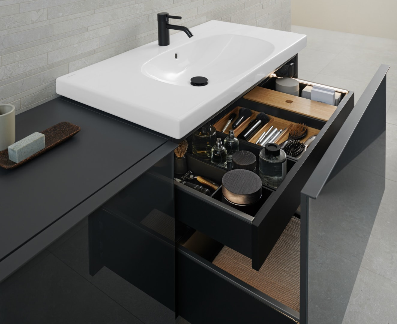 unterbaufähig, aus Sanitärkeramik, kombinierbar mit Acanto Unterschrank für Waschtisch mit Schublade und einer Innenschublade und Geruchsverschluss