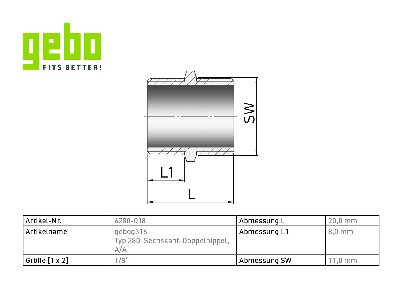 Gebo Edelstahl-Gewindefittings - Sechskant-Doppelnippel 1/8" - A/A