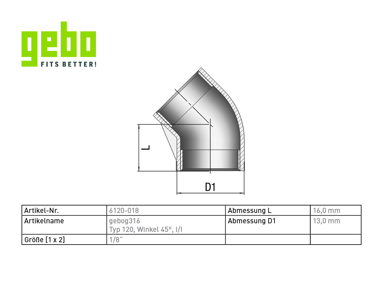 Gebo Edelstahl-Gewindefittings - Winkel 45 - 1/8" - I/I