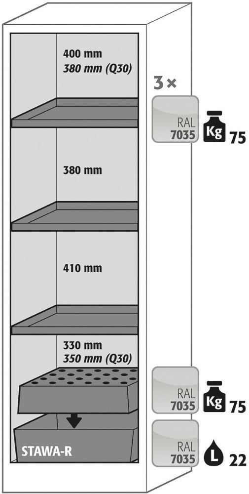 Lieferung: Schrank mit 3 Fachböden, 1 Lochblecheinsatz (75 kg Tragkraft), 1 Bodenauffangwanne gem. StawaR.
