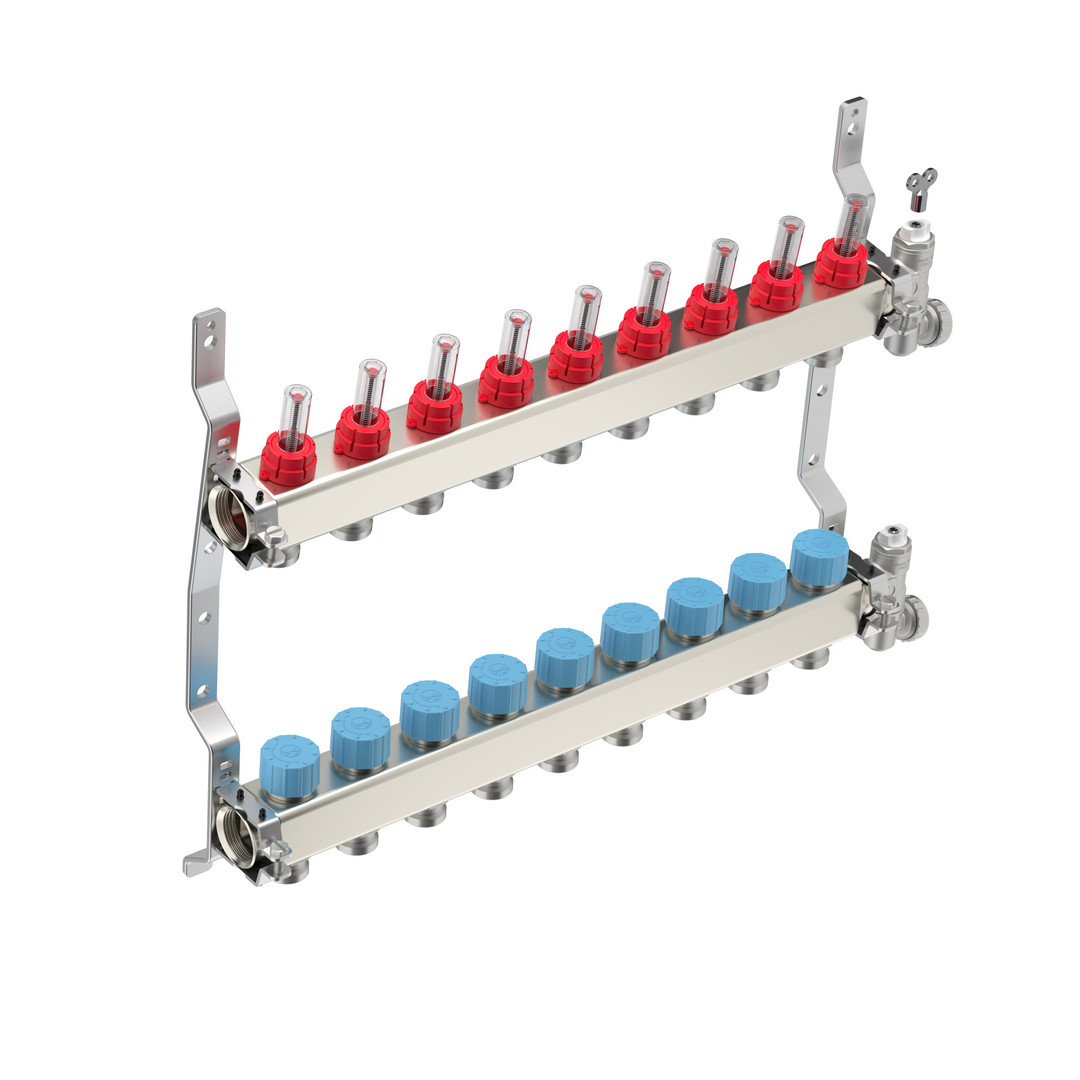 vormontiert, aus Edelstahl mit dynamischen Ventileinsätzen und integrierten Durchflussmengenmessern im Vorlauf, High-Flow Variante: Einstellskala von 0-5 l/min, sekundärer Anschluss Eurokonus, Rücklaufverteiler mit Absperrventilen, M 30 x 1,5 mm zur Montage von elektrothermischen Stellantrieben, mit Verteilerendstücken mit Entleerungshahn, manuellem Entlüfter, Halterungen mit schalldämmender Einlage aus verzinktem Stahl zur Montage in Verteilerkästen oder an der Wand, mit Voreinstellschlüssel R73PY010