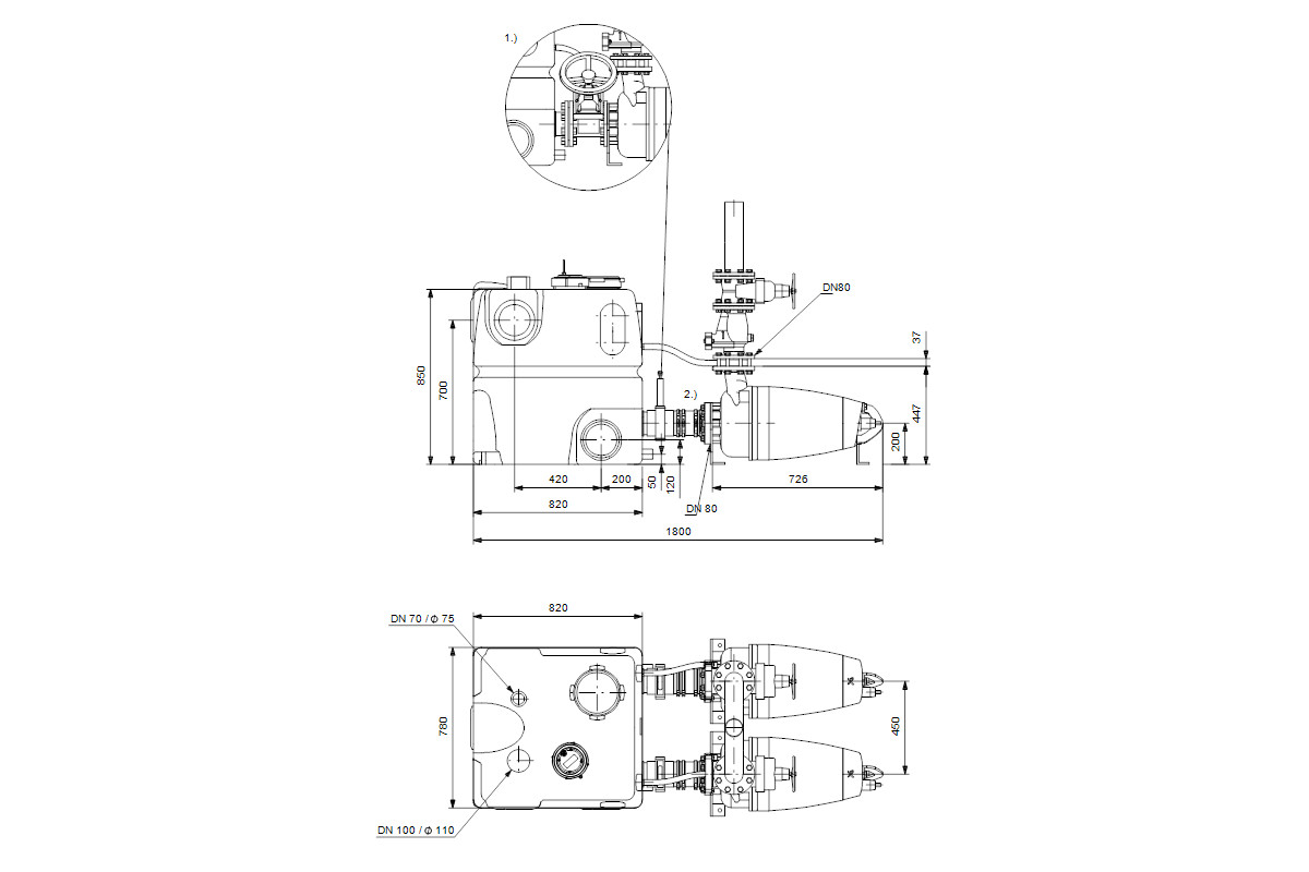 ein abwasserbeständiger, gas- und druckdichter Sammelbehälter mit Zulaufsteckdichtung DN 150, Anschlussstutzen DN 70 für Luftungsleitung mit elastischem Verbinder Ø 75 mm und Schellen, Anschlussstutzen Ø 50 mm, 2 Satz Flanschstutzen mit elastischen Verbindern Ø 110 mm mit Schellen für saugseitigen Pumpenanschluss an Behälter, piezoresistiver Drucksensor zur millimetergenauen Ermittlung aller erforderlichen Pegel wie Normal-, Hochwasser- und Alarmniveau, elektrischer Signalverarbeitung, 10 m Signalleitung zur Steuerung, Steuergerät mit eingebauter Alarmanlage, 2 anschlussfertige Pumpen der Baureihe SE mit 10 m Kabel, dauerlaufgeeignet, gemäß S1-Betrieb und überflutungssicher, Befestigungsmaterial zur Pumpenmontage und zur Auftriebssicherung im Lieferumfang, Anlagen um bis zu zwei Behälter (Zubehör) erweiterbar, für jeden weiteren Behälter je 2 Verbindungsstutzen, mit Steckdichtungen und je ein Satz Schellen