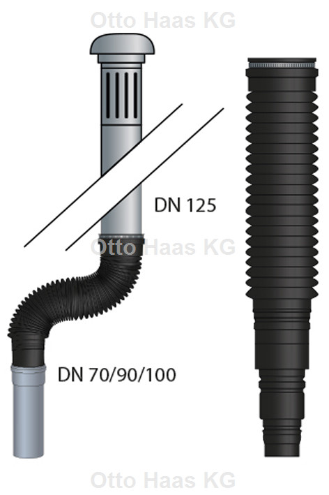 flexible Verbindung zwischen Dunsthut und Fallrohr, Überbrückung von Längendifferenzen und gleichen Achsversätzen von max. 45° bis zur Lotrechten, geeignet für dachseitigen Anschluss DN 125, witterungs-, alterungs- und formbeständig