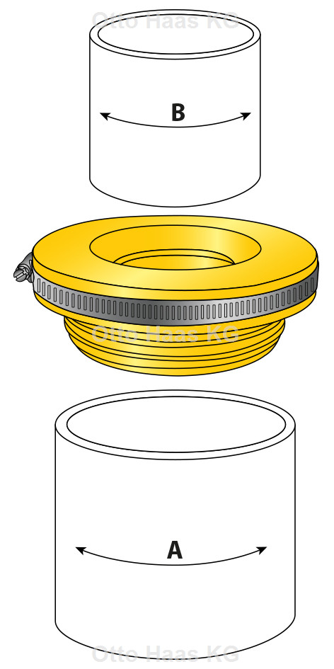 innenliegender Adapter, zur Verbindung und Reduzierung von Abwasserrohren mit unterschiedlichen Außen- bzw. Innenrohrdurchmessern, für waagerechten wie senkrechten Einbau geeignet, passend für Faserzement-/Eternitrohr/Geberit PE/Geberit Silent-db 20/Geberit Silent-PP/Gusseisenrohr GGG duktil/HT-Rohr/KG-Rohr/LNA Gusseisenrohr/LORO-X/POLO-KAL NG/Skolan db/SML/MLB/Steinzeugrohr Harsch und Wavin AS, druckdicht bis 0,5 bar, UV-beständig, CE-konform, EPDM alterungs- und witterungsbeständig nach DIN EN 681-1, mit Schlauchklemmen W2, Band und Gehäuse aus nichtrostendem Chromstahl 1.l4016 X6Cr17 nach DIN 3017-1, SW 7, Außensechskantschraube W1