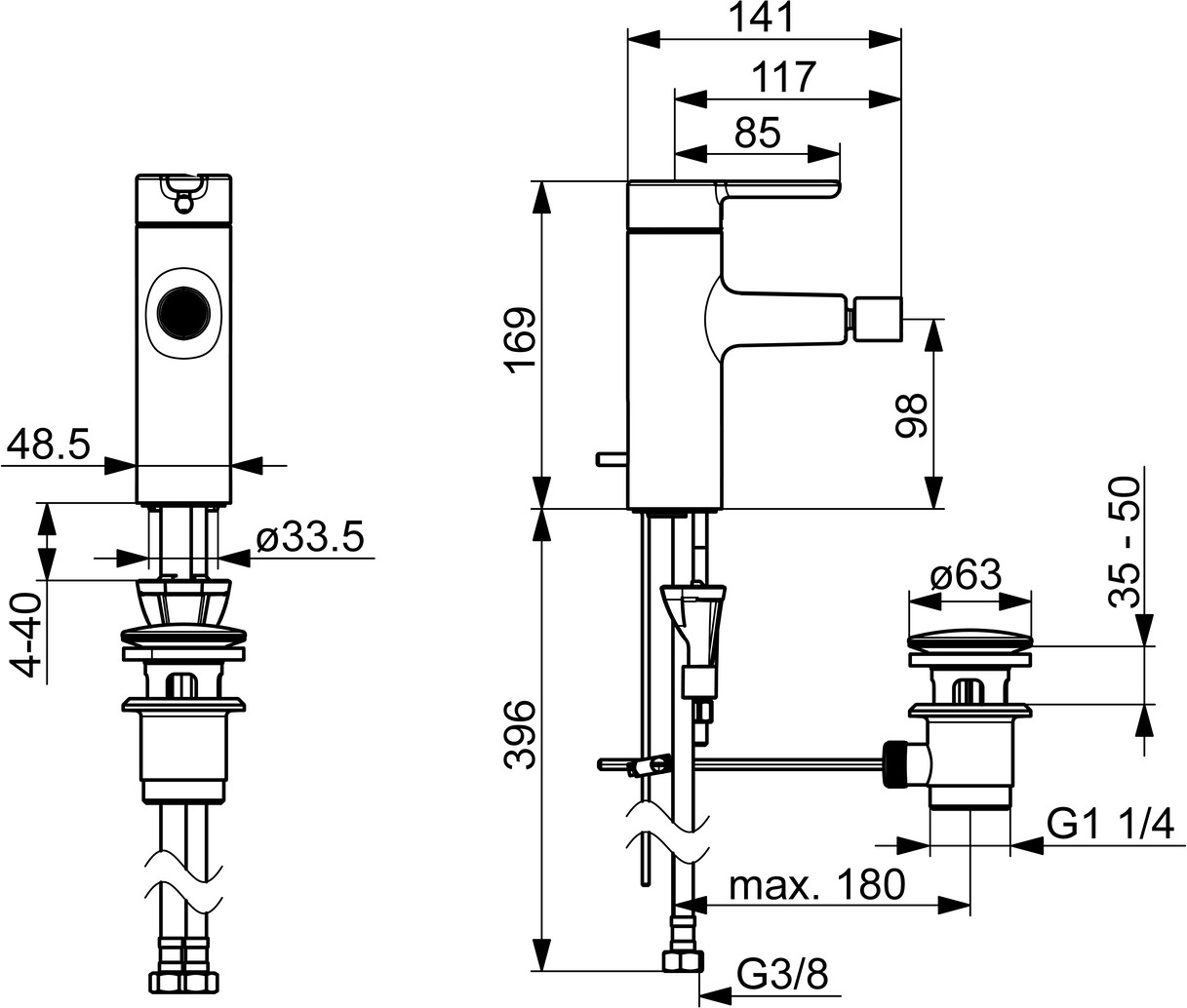 HANSA Bidet-Einhebelmischer HANSADESIGNO Style Hebel seitlich, mit Zugstangen-Ablaufgarnitur, Ausladung 119mm, chrom W314085