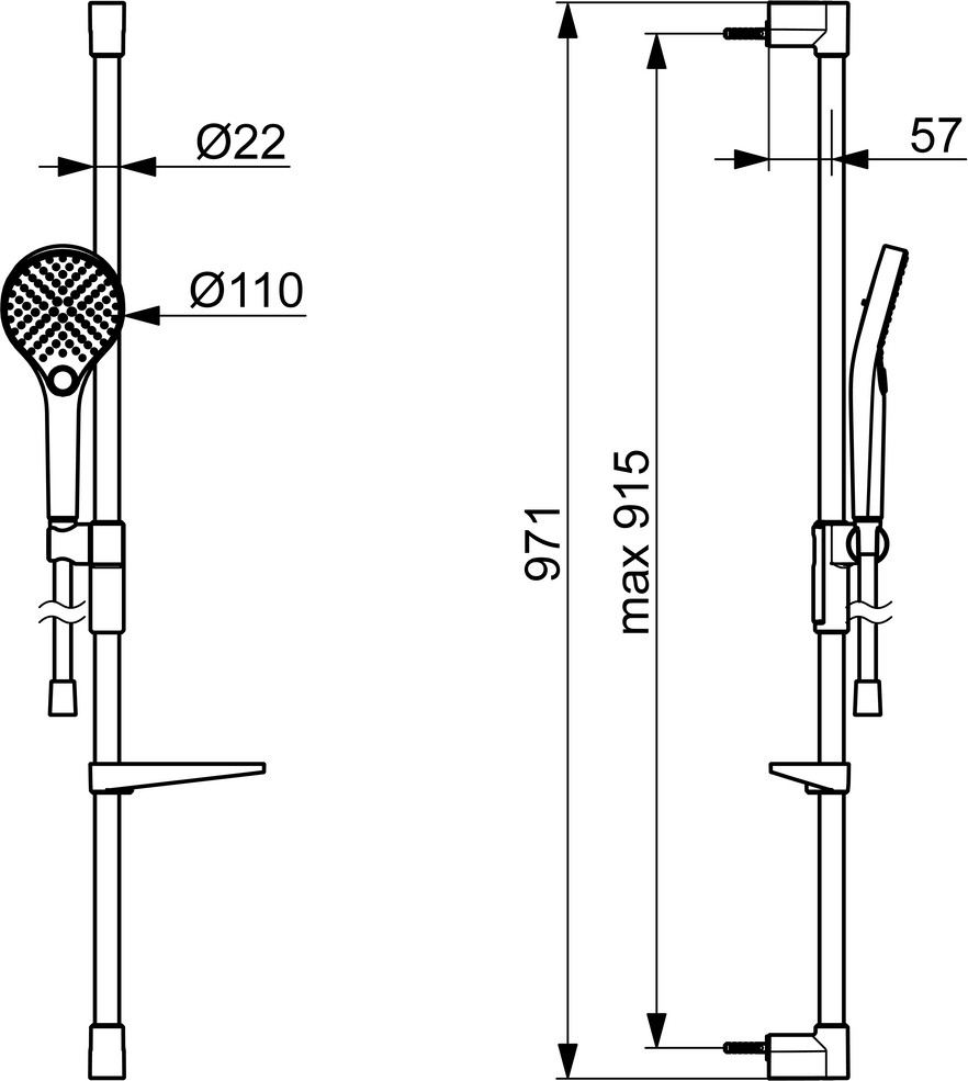 Heißwasserversorgung max. 65°C, Arbeitsdruck 1-10 bar, Durchfluss bei 3 bar (mit Regler) 7,8 l/min, Durchmesser Ø 22 mm, Handbrausengröße Ø 110 mm, Installationsabstand max. 915 mm, Länge 971 mm, Geräuschklasse 0,2 l/s I (ISO 3822), Handbrause, Brausestange, verstellbare Brausestangehalterung, Seifenschale, Brauseschlauch (1750 mm), Eco-Durchfuss, Variable Montagemöglichkeit, Anti-KalkTechnik, Twist guard, Verdrehschutz für Brauseschlauch, kürzbar, Schlauchdurchführung, drehbar, 3-strahlig