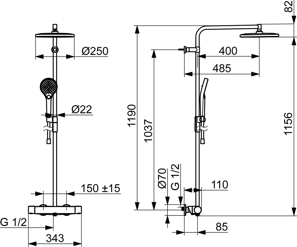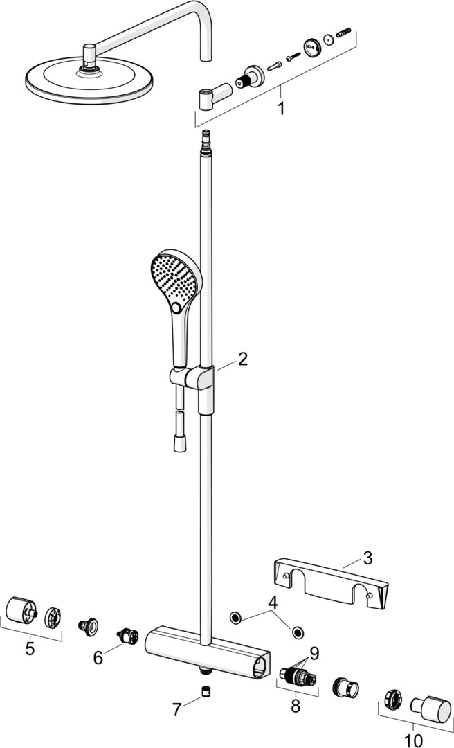 Heißwasserversorgung max. 80°C, Arbeitsdruck 1-10 bar, Spar-Durchfuss bei 3 bar 7,2 l/min, Durchfluss bei 3 bar 12 / 12 l/min, Anschlussgröße G3/4, Kopfbrausengröße Ø 250 mm, Handbrausengröße Ø 110 mm, Installationsabstand 150 ± 15 mm, Sicherungseinrichtung (EN1717) EB, Geräuschklasse I (ISO 3822), Material Messing/Verbundwerkstoff, schwenkbares Kugelgelenk, Handbrause, In Mittelstellung arretierbar, abnehmbare Ablage mit magnetischer Befestigung, verstellbare Brausestangehalterung, schwenkbare Kopfbrause, Brauseschlauch (1750 mm), Brausestange, Anti-Kalk-Technik, Twist guard, Verdrehschutz für Brauseschlauch, variable Montagemöglichkeit, Oberteil mit keramischen Dichtscheiben zur Wassermengeneinstellung für einen Abgang, Thermostatkartusche zur Temperaturreglung, Rückfussverhinderer, Schmutzflter, Drehumsteller, druckunabhängig, integrierter Umsteller mit Absperrung, S-Anschlüsse, Abdeckung(en), Schalldämpfer 3-strahlig, Temperatureinstellgriff, Durchfusseinstellgriff, Hebel mit W+K-Kennzeichnung, Easy-Grip Bedienhebel, Eco-Funktion für die Wassermenge, Sicherheitssperre gegen Verbrühen bei 38°C, mehr Sicherheit durch minimales Erwärmen des Armaturengehäuses, kürzbar, Schlauchdurchführung, drehbar