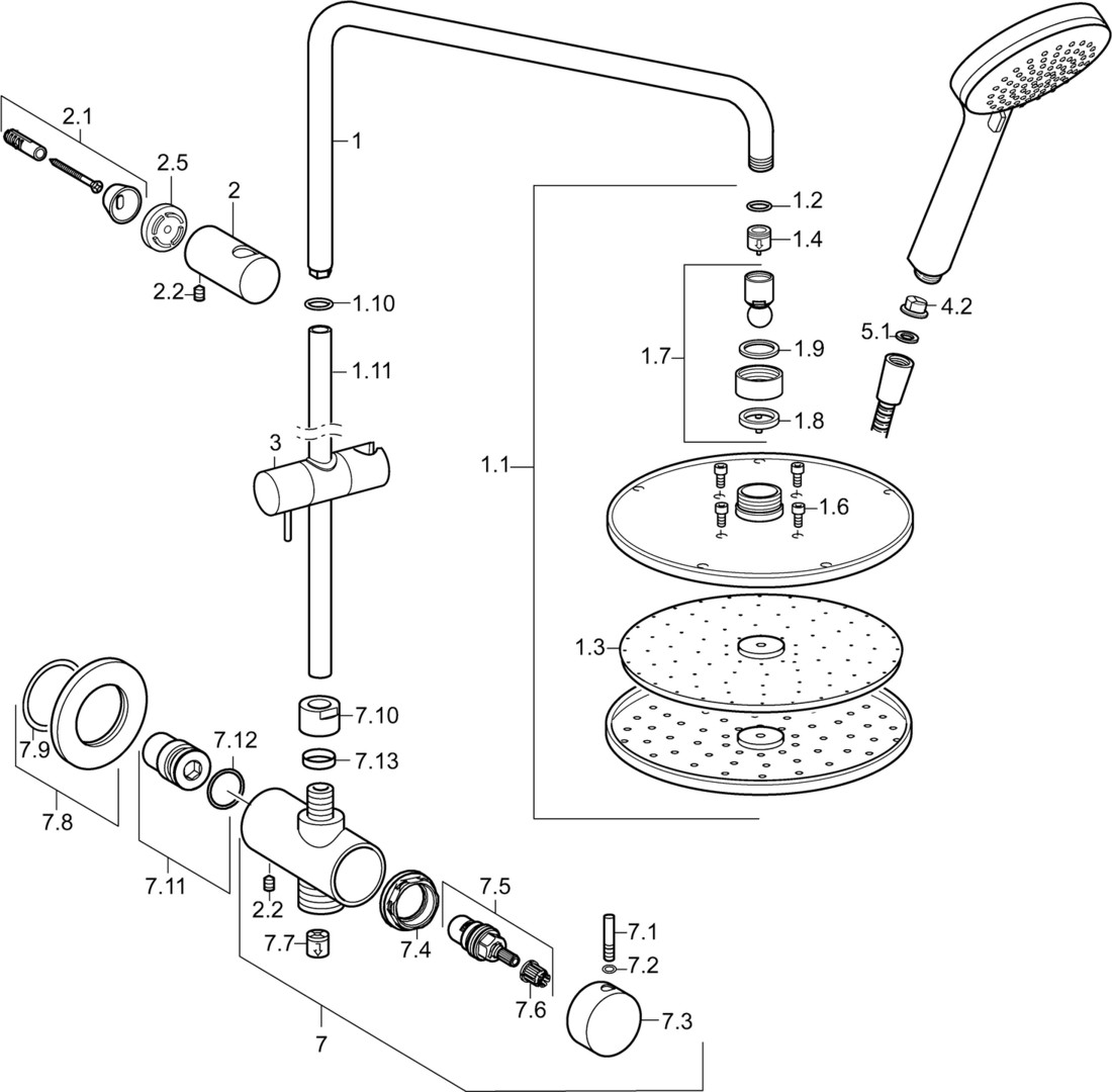 DN 15, Durchflussmenge 12 l/min, gemessen bei 3 bar Fließdruck, Heißwasserversorgung max. 65 °C, kürzbar, Laminare Wasserstrahlen, ohne Luftbeimischung, Kopfbrause Ø 202 mm, Drehumstellung, druckunabhängig, Handbrause Ø 95 mm, Brausestange, Brauseschlauch (1250 mm), Eco-Durchfluss, 3-strahlig, gerade Wandanschlüsse, direkter Anschluss, Außengewinde, G 1/2, Oberteil mit keramische Dichtscheiben zur Wassermengeneinstellung für einen Abgang, Rückflussverhinderer, Schmutzfilter