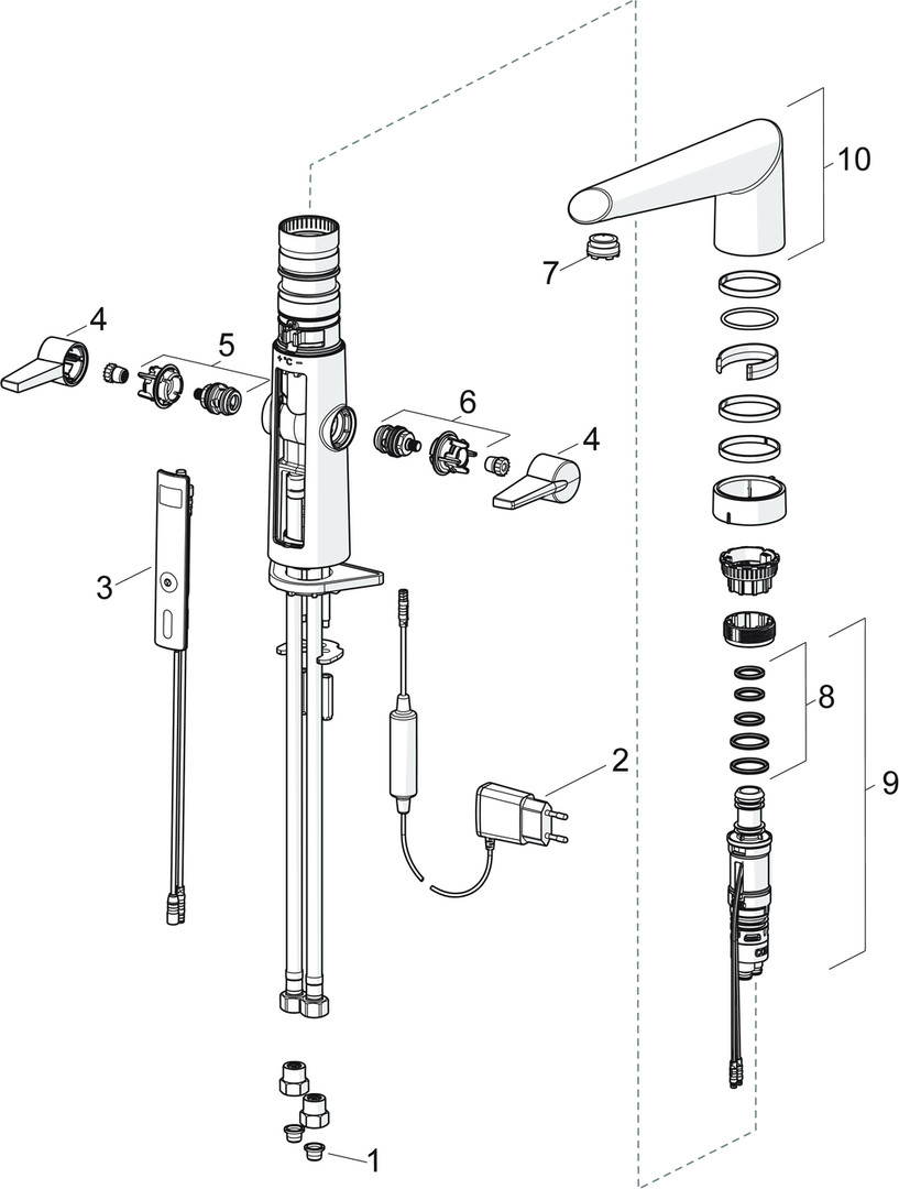 DN 15, Durchflussmenge 12 l/min, gemessen bei 3 bar Fließdruck, Heißwasserversorgung max. 70 °C, Armaturenkörper aus entzinkungsbeständigem Messing (DZR), Messing in Trinkwasserkontakt enthält weniger als 0,3 % Blei, Wasserwege ohne Nickelbeschichtung, Einstellung per Tasten veränderbar, Zweihandbedienhebel/Griffe, Anschluss über flexible Druckschläuche G 3/8, Oberteil mit keramischen Dichtscheiben zur Wassermengeneinstellung für einen Abgang, Mischventil zur manuellen Temperatureinstellung, Schmutzfilter, PSD-Sensor mit Autofocus, Magnetventil, Kontrolleinheit, mit Netzteil, Signalleuchten, automatische Hygienespülung, Schwenkbereich des Auslaufs 120° (80°/60°), Anschlag herausnehmbar, Cascade-Strahlregler, Cache Strahlregler ohne Mundstück direkt in den Armaturenauslauf geschraubt, max. Fließdauer 40 s, Betriebsspannung 5 V