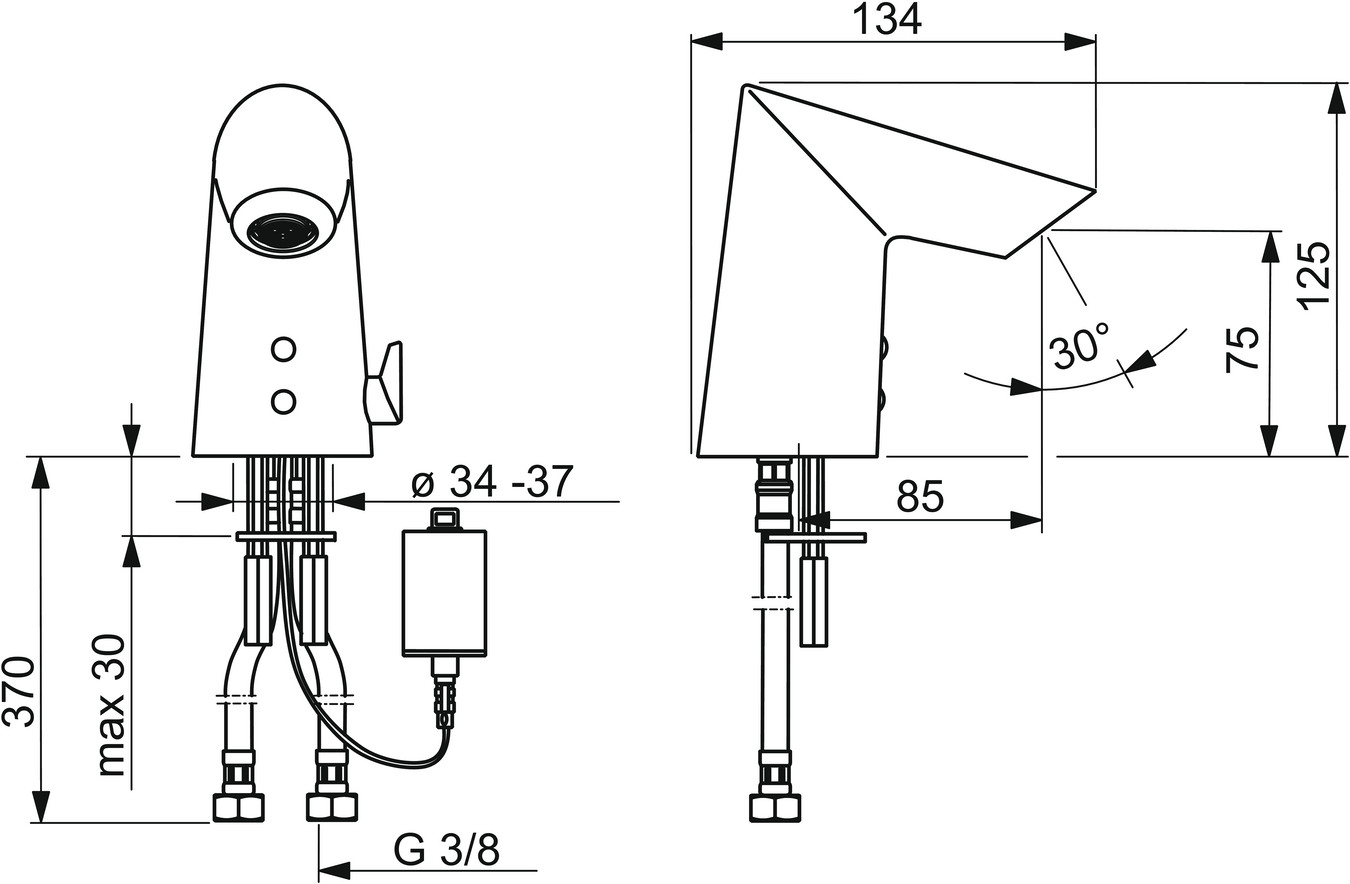 DN 15, Durchflussmenge 4,8 l/min, gemessen bei 3 bar Fließdruck, Heißwasserversorgung max. 70 °C, Berührungslos, Bluetooth fähig, Einstellung per App veränderbar, Armatur ist GGT geprüft, Temperatureinstellgriff, Heißwassersperre einstellbar, Anschluss über flexible Druckschläuche G 3/8, Mischventil zur manuellen Temperatureinstellung, Rückflussverhinderer, Schmutzfilter, PSD-Sensor mit Autofocus, Magnetventil, Batterie-Leer-Anzeige, Batterie Lithium 2CR5 6 V, ohne Zugstangenbohrung, automatische Hygienespülung, feststehender Auslauf, Cache-Strahlregler ohne Mundstück direkt in den Armaturenauslauf geschraubt, max. Fließdauer 2 min, Betriebsspannung 6 V, Zubehör Abdeckstopfen 1010087V