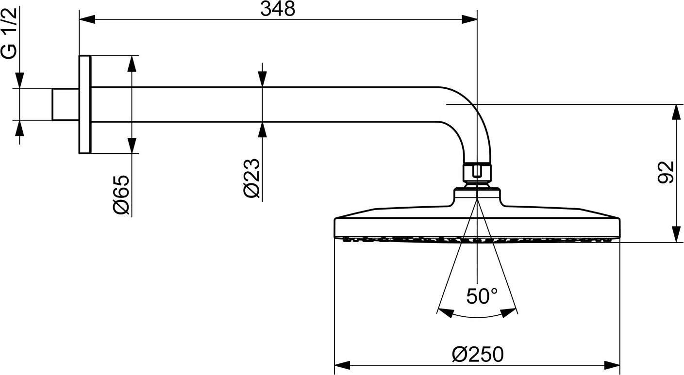 Heißwasserversorgung max. 90°C, Arbeitsdruck 0,5-5 bar, Durchfluss bei 3 bar (mit Regler) 12 l/min, Anschlussgröße G1/2, Kopfbrausengröße Ø 250 mm, Ausladung 348 mm, Geräuschklasse 0,2 l/s II (ISO 3822), Material Messing, Kopfbrause, schwenkbares Kugelgelenk, Anti-Kalk-Technik Außengewinde, Abdeckung(en), 1-strahlig