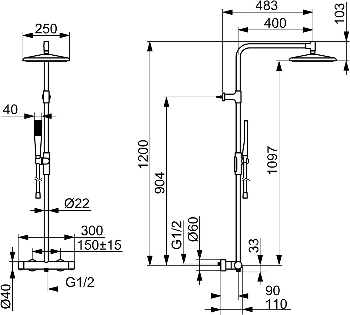Heißwasserversorgung max. 65°C, Arbeitsdruck 1-10 bar, Spar-Durchfuss bei 3 bar 7,2 l/min, Durchfluss bei 3 bar 7,8 l/min, Anschlussgröße G1/2, Kopfbrausengröße 250 x 250 mm, Handbrausengröße 30 x 75 mm, Installationsabstand 150 ± 15 mm, Sicherungseinrichtung (EN1717) EB, Geräuschklasse I (ISO 3822), Material Messing/Verbundwerkstoff, Handbrause, Schwenkbare Kopfbrause, in Mittelstellung arretierbar, Schwenkbares Kugelgelenk, Brausestange, variable Montagemöglichkeit, verstellbare Brausestangehalterung, Anti-Kalk-Technik, Brauseschlauch (1750 mm), Twist guard, Verdrehschutz für Brauseschlauch, Sicherheitssperre gegen Verbrühen bei 38°C, mehr Sicherheit durch minimales Erwärmen des Armaturengehäuses Drehumsteller, druckunabhängig, integrierter Umsteller mit Absperrung, direkter Anschluss, Innengewinde, Abdeckung(en), Temperatureinstellgriff, Durchfusseinstellgriff, Hebel mit W+K-Kennzeichnung, Eco-Funktion für die Wassermenge, Thermostatkartusche zur Temperaturreglung, Rückfussverhinderer, Schmutzflter, kürzbar, Schlauchdurchführung, drehbar, 1-strahlig