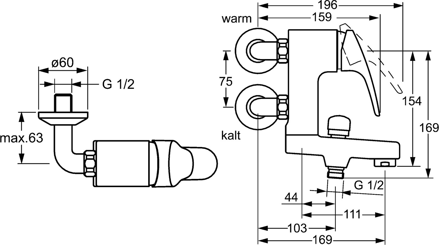DN 15, Wandmontage, Durchflussmenge 22,8/21 l/min, gemessen bei 3 bar Fließdruck, Heißwasserversorgung max. 80 °C, Zugumsteller, automatische Rückstellung, Armaturenkörper aus entzinkungsbeständigem Messing (DZR), eigensicher gegen Rückfließen im häuslichen Gebrauch (nach DIN EN 1717), Auslauf 15° umsteckbar, Hebel W+K-Kennzeichnung, Temperaturbegrenzer, Heißwassersperre einstellbar, Schalldämpfer, HANSAECO Ø 4,8 Steuerpatrone mit keramischen Dichtscheiben zur Wassermengen- und Temperatureinstellung, Wasserbremse bei ca. 60 % Wassermenge, Rückflussverhinderer
