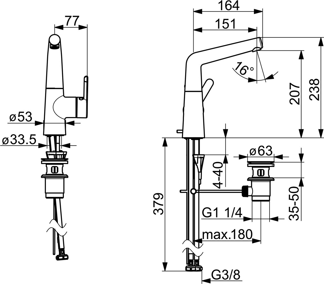 DN 15, Heißwasserversorgung max. 70°C, Arbeitsdruck 0,5-10 bar, Durchfluss bei 3 bar (mit Regler) 6 l/min, Anschlussgröße G3/8, Schwenkbereich 120°, Ausladung 151 mm, Sicherungseinrichtung (EN1717) AA, Geräuschklasse I (ISO 3822), Material Messing, konstante Durchfussleistung unabhängig vom Fließdruck, Integrierter Strahlregler, ohne Mundstück direkt in den Armaturenauslauf geschraubt, Anschluss über fexible Druckschläuche, Armaturenkörper aus entzinkungsbeständigem Messing (DZR), 3S-Installation System für sichere und schnelle Montage,schwenkbarer Auslauf, Anschlag herausnehmbar, Temperaturbegrenzer, Ø 4,0 Steuerpatrone mit keramischen Dichtscheiben zur Wassermengen- und Temperatureinstellung, Hebel mit W+K-Kennzeichnung, Einhandbedienhebel/Griff, Ablaufgarnitur mit Zugstange