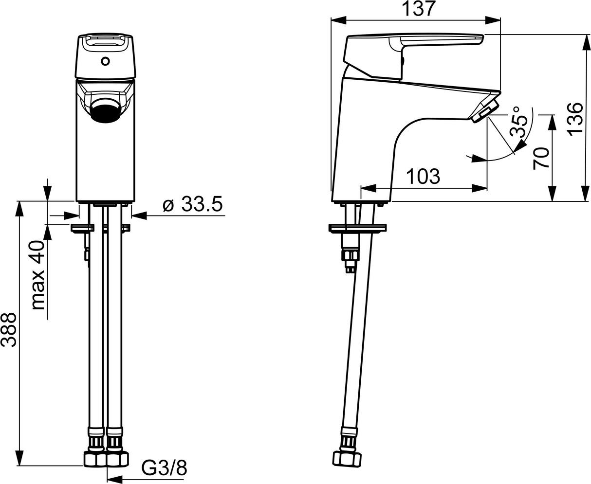 DN 15, Heißwasserversorgung max. 70°C, Arbeitsdruck 0,5-10 bar, Durchfluss bei 3 bar (mit Regler) 6 l/min, Anschlussgröße G3/8, Ausladung 103 mm, Sicherungseinrichtung (EN1717) AA, Geräuschklasse I (ISO3822), Material Messing, Ø 3,5 classic Steuerpatrone mit keramischen Dichtscheiben zur Wassermengen- und Temperatureinstellung, ohne Zugstangenbohrung, Temperaturbegrenzer, Heißwassersperre einstellbar (im Lieferumfang enthalten), konstante Durchfussleistung unabhängig vom Fließdruck, feststehender Auslauf, Armaturenkörper aus entzinkungsbeständigem Messing (DZR), Rapid-Montagesystem, Hebel mit W+K-Kennzeichnung, Einhandbedienhebel/Griff, Anschluss über fexible Druckschläuche
