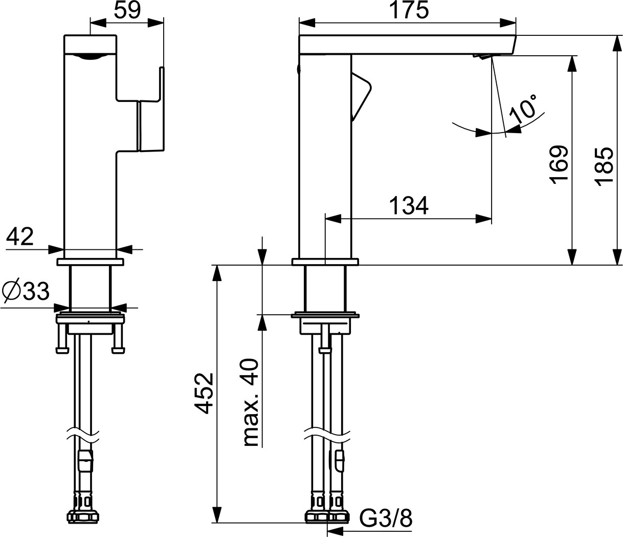 Heißwasserversorgung max. 70°C, Arbeitsdruck 0,5-10 bar, Durchfluss bei 3 bar (mit Regler) 4,8 l/min, Anschlussgröße G3/8, Schwenkbereich 150°, Ausladung 134 mm, Sicherungseinrichtung (EN1717) AA, Geräuschklasse I (ISO 3822), Material Messing, Ø 2,5 Steuerpatrone mit keramischen Dichtscheiben zur Wassermengen- und Temperatureinstellung, Anschluss über fexible Druckschläuche, konstante Durchfussleistung unabhängig vom Fließdruck, schwenkbar, Schwenkauslauf mit Arretierung in mittlerer Position, Armaturenkörper aus entzinkungsbeständigem Messing (DZR), Einhandbedienhebel/Griff, Hebel mit W+K Kennzeichnung, schwenkbarer Auslauf