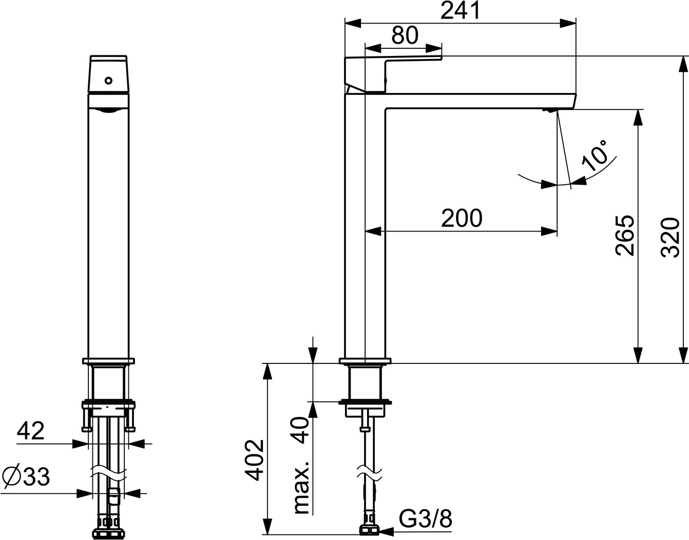 Heißwasserversorgung max. 70°C, Arbeitsdruck 0,5-10 bar, Durchfluss bei 3 bar (mit Regler) 4,8 l/min, Anschlussgröße G3/8, Ausladung 200 mm, Sicherungseinrichtung (EN1717) AA, Geräuschklasse I (ISO 3822), Material Messing, Ø 2,5 Steuerpatrone mit keramischen Dichtscheiben zur Wassermengen- und Temperatureinstellung, feststehender Auslauf, konstante Durchfussleistung unabhängig vom Fließdruck, schwenkbar, Anschluss über fexible Druckschläuche, Armaturenkörper aus entzinkungsbeständigem Messing (DZR), Einhandbedienhebel/Griff, Hebel mit W+K Kennzeichnung