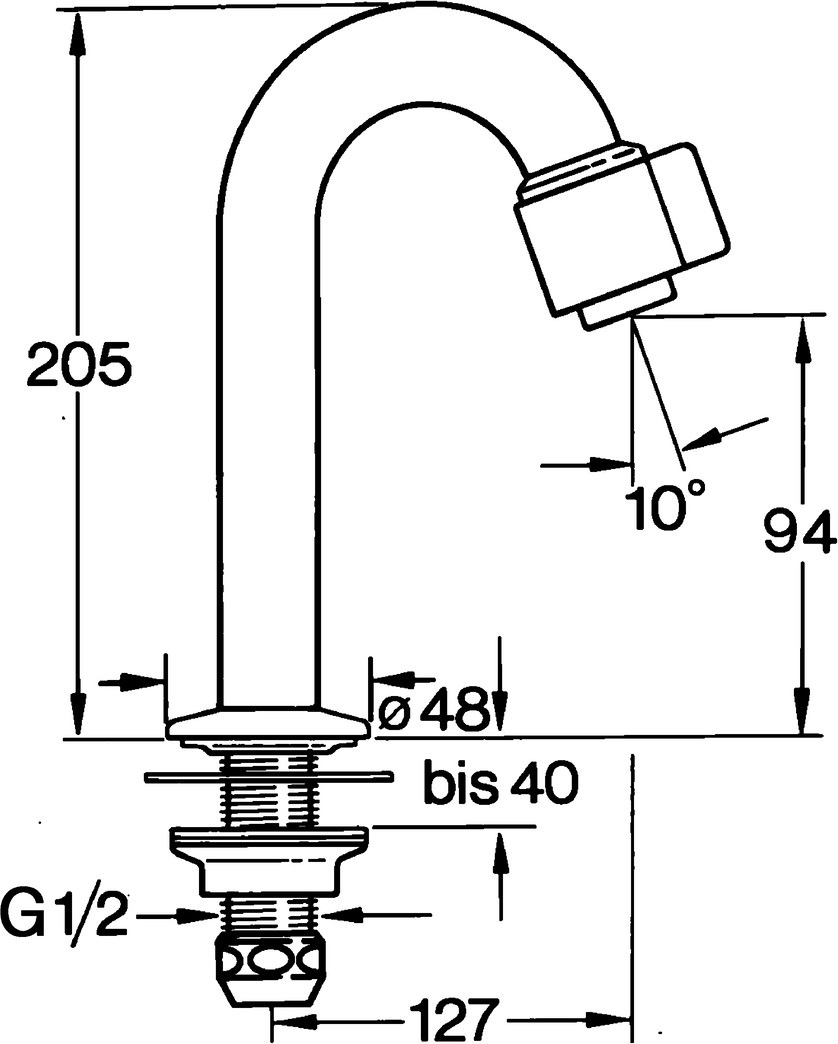 DN 15, Heißwasserversorgung max. 80°C, Arbeitsdruck 0,5-10 bar, Durchfluss bei 3 bar 6 l/min, Anschlussgröße G1/2, Ausladung 127 mm, Sicherungseinrichtung (EN1717) AA, Geräuschklasse I (ISO 3822), Material Messing, Oberteil mit keramischen Dichtscheiben zur Wassermengeneinstellung für einen Abgang, 1 Zuleitung, für Kalt- oder Mischwasser, feststehender Auslauf, Einhandbedienhebel/Griff, Strahlregler, ohne Ablaufgarnitur