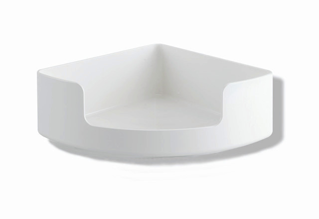 rechtwinklig mit einem Viertelkreis geformte Ablage mit hohen Seitenwänden und Wasserablauf, Aussparung an der Vorderseite, zum Aufstecken auf Stangensystem Ø 33 mm, Boden mit Wasserablaufschräge und Antirutschprofil, 120 mm hoch, Belastbarkeit 3 kg, aus Polyamid