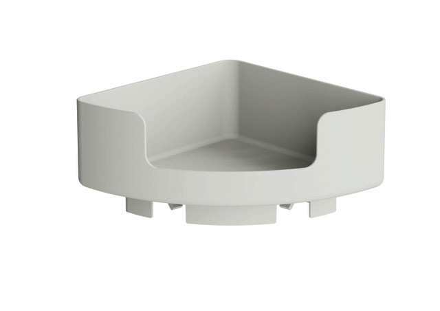 rechtwinklig mit einem Viertelkreis geformte Ablage mit hohen Seitenwänden und Wasserablauf, Aussparung an der Vorderseite, zum Aufstecken auf Stangensystem Ø 33 mm, Boden mit Wasserablaufschräge und Antirutschprofil, 120 mm hoch, Belastbarkeit 3 kg, aus mattem Polyamid