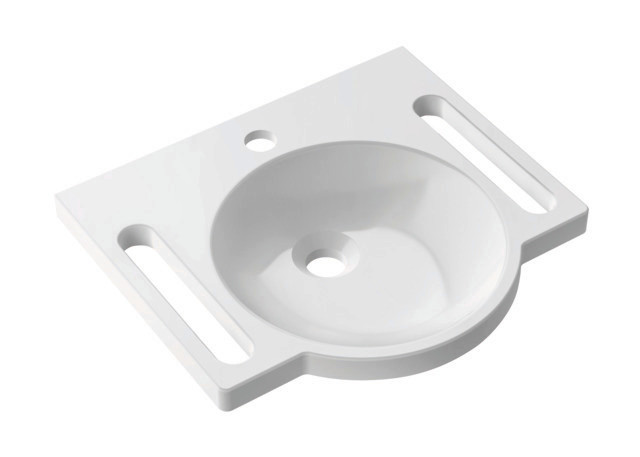 mit Ablagefläche und rundem Becken, ohne Überlauf, mit porenfreier Oberfläche, integrierte Haltemöglichkeit, als Handtuchhalter nutzbar, unterfahrbar, belastbar nach DIN EN 14688, für Stockschraubenbefestigung
