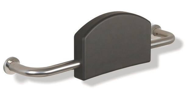 gepolsterte Lehne mit beidseitig angebrachten, rechtwinklig gebogenen Stangen und Befestigungsrosetten, erfüllt die Anforderungen nach DIN 18040 und ÖNORM B1600/1601, Achsmaß von 670-730 mm bauseits verstellbar, Stangen Ø 33 mm, Rohrstärke 2 mm, Rosetten Ø 70 mm, Rückenstütze 350 mm breit, Rückenpolster aus schwarzem PUR, mit Befestigungsmaterial BM211