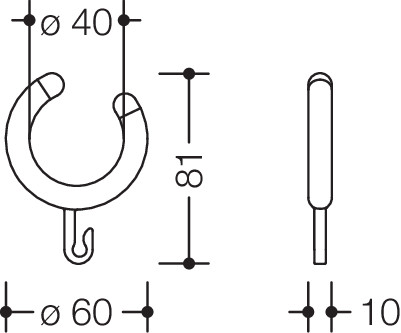 für Vorhangstangen 800.34.., 801.34.., 805.34.., offene Ringe mit kleinem Haken, außen ø 60 mm, innen ø 40 mm, 10 mm stark, aus Polyamid mit Ringenden aus POM