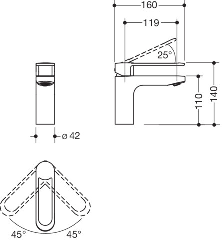 Durchfluss 5 l/min, Keramikkartusche Kerox K-35OP, druckfest bis 35 bar, Laminar-Strahlregler mit dynamischer Mengenregulierung 5 l/min, winkelverstellbar und diebstahlgeschützt, Anschluss über flexible Druckschläuche mit eingeflochtener Warm-Kalt-Markierung, 450 mm, G 3/8, Armaturenkörper Messing, offener Bedienhebel mit Warm-Kalt-Kennzeichnung, 140 mm hoch, Auslauf starr, ohne Ablaufgarnitur, geeignet für thermische Desinfektion nach DVGW W 551, Geräuschklasse 1, DVGW geprüft, mit WELL-Label
