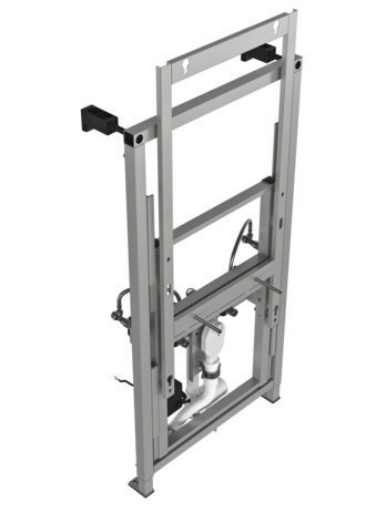 elektrisch höhenverstellbares Waschtisch-Vorwandelement, Steuerung per Funkfernbedienung, Waschtischhöhe stufenlos um 300 mm verstellbar (700/710-1000/1010 mm), anpassbare Ausgangshöhe des Waschtischs durch verstellbare Bodenstützen, Bodenstütze 150 mm in der Höhe verstellbar, 690 x 1355-1505 x 210-240 mm tief, aus Stahl, pulverbeschichtet, belastbar bis 150 kg, mit Boden- und Wandbefestigungsmaterial für Beton und Kalksandvollstein, Schallentkopplung sämtlicher Leitungen und des Installationselementes vom Baukörper