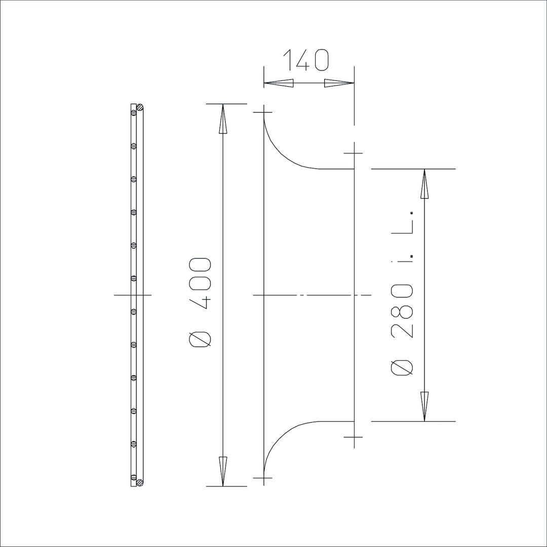 für Axial- und VAR-Ventilatoren, mit großem Einlaufradius, aus Stahlblech gedrückt, feuerverzinkt, Anschlussseitig mit Flansch nach DIN 24155 (Bl. 2), Schutzgitter zur saugseitigen Abdeckung pulverbeschichtet (ab Ø 800 verzinkt)/DIN EN ISO 13857 entsprechend