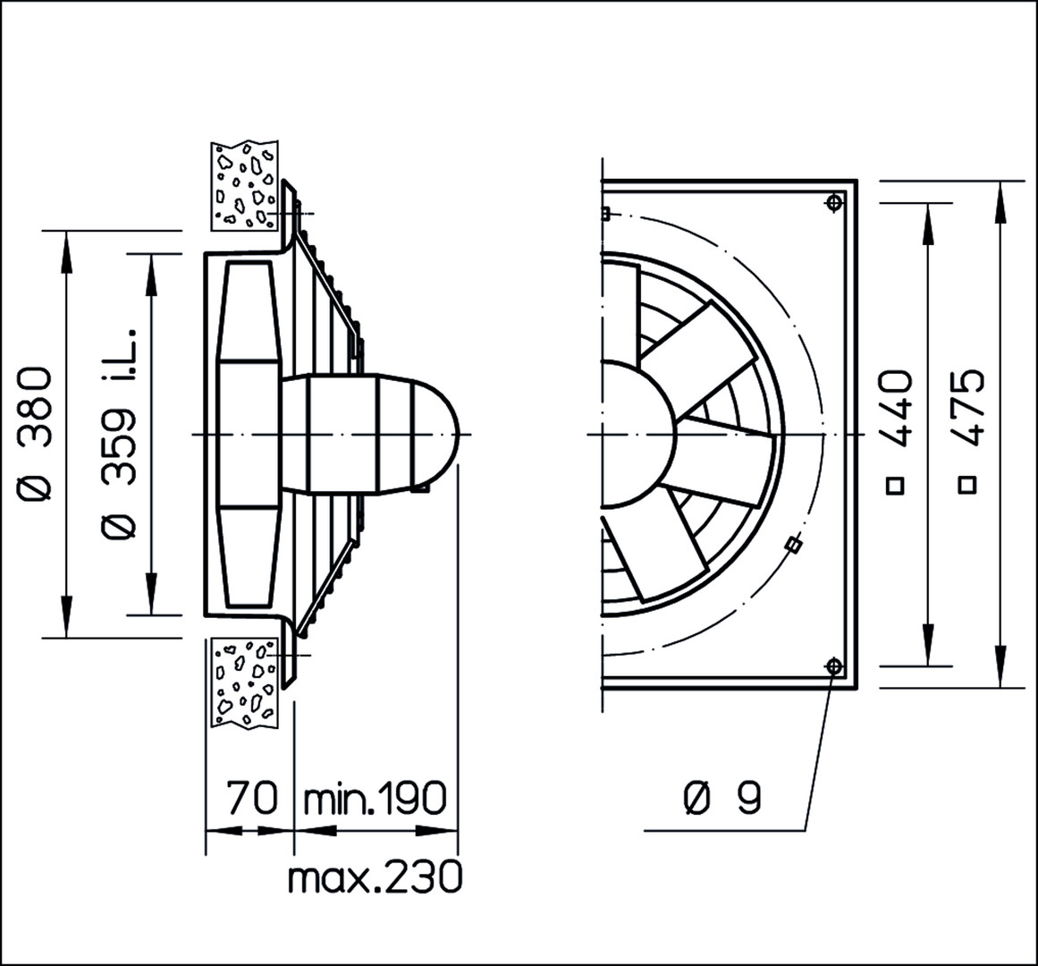 Gehäuse aus verzinktem Stahlblech mit zusätzlicher Zweischicht-Lackierung in papyrusweiß, Ex-Typen ohne Lackierung, Laufrad mit profilierten Schaufeln aus Kunststoff /dynamisch ausgewuchtet (Abweichung bei Ex-Typen), geschlossenes Aluminiumdruckguss-Gehäuse, Antrieb kugelgelagert (wartungs- und funkstörungsfrei, Wicklung mit Feuchtschutzimprägnierung, bis auf 3~ ex-geschützte Typen sind mit Thermokanten ausgerüstet, serienmäßiger Klemmkasten (Schutzart IP 54/55) an Motorrückseite (zusätzlich außen am Rohr, Abweichung bei Ex-Typen), Schutzgitter aus pulverbeschichtetem Stahl, Wendebetrieb mittels Wendeschalter reversierbar, Einbau in jeder Lage möglich (jedoch einsatzabhängig, evtl. Kondenswasserbohrungen beachten)