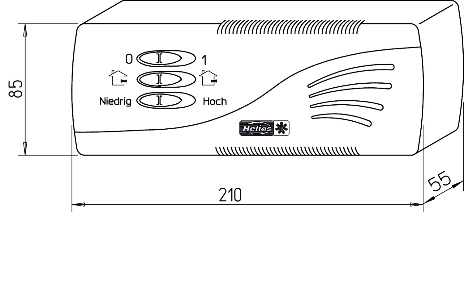 für Auf- und Unterputzinstallation in trockenen Räumen, 3 Schiebeschalter (Funktion: 2-poliger Betriebsschalter Ein/Aus mit Betriebsanzeige, hohe bzw. niedrige Drehzahl und Wendeschalter), 230 V, 1~, 50/60 Hz, IP 20, 210 x 85 x 55 mm, Gehäuse aus Kunststoff in weiß