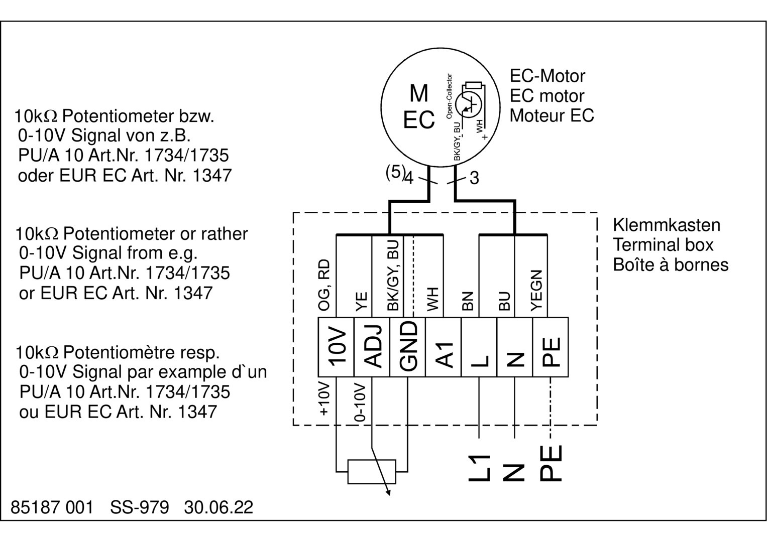 zur Förderung mittlerer und kleinerer Luftvolumen gegen hohe Widerstände, drehzahlsteuerbarer EC-Außenläufermotor in Schutzart IP 44 (Wartungs- und funkstörungsfrei, kugelgelagert), integrierte elektronische Temperaturüberwachung für EC-Motor und Elektronik, Montage in jeder Lage, Gehäuse aus verzinktem Stahlblech, Klemmenkasten (IP 54) außen am Gehäuse, rückwärts gekrümmte Schaufeln aus Kunststoff, durch saug- und druckseitigen Einbau in ein Rohrsystem ist IP 54 gegeben