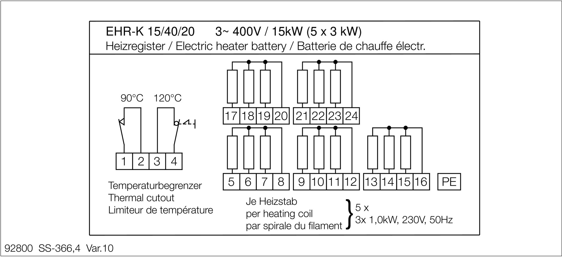 geschlossener Rohrheizkörper in verzinktem Stahlblechgehäuse mit beidseitigen Anschlussflanschen für Einbau in Kanalverlauf, Rohrheizkörper mit niedriger Oberflächentemperatur auf außenliegenden Anschlusskasten verdrahtet (in mehreren Gruppen schaltbar), ausgerüstet mit einem selbstständig rückstellenden Temperaturbegrenzer (Auslösetemperatur 90 °C) und einem manuell rückstellbaren Temperaturbegrenzer (Auslösetemperatur 120 °C)