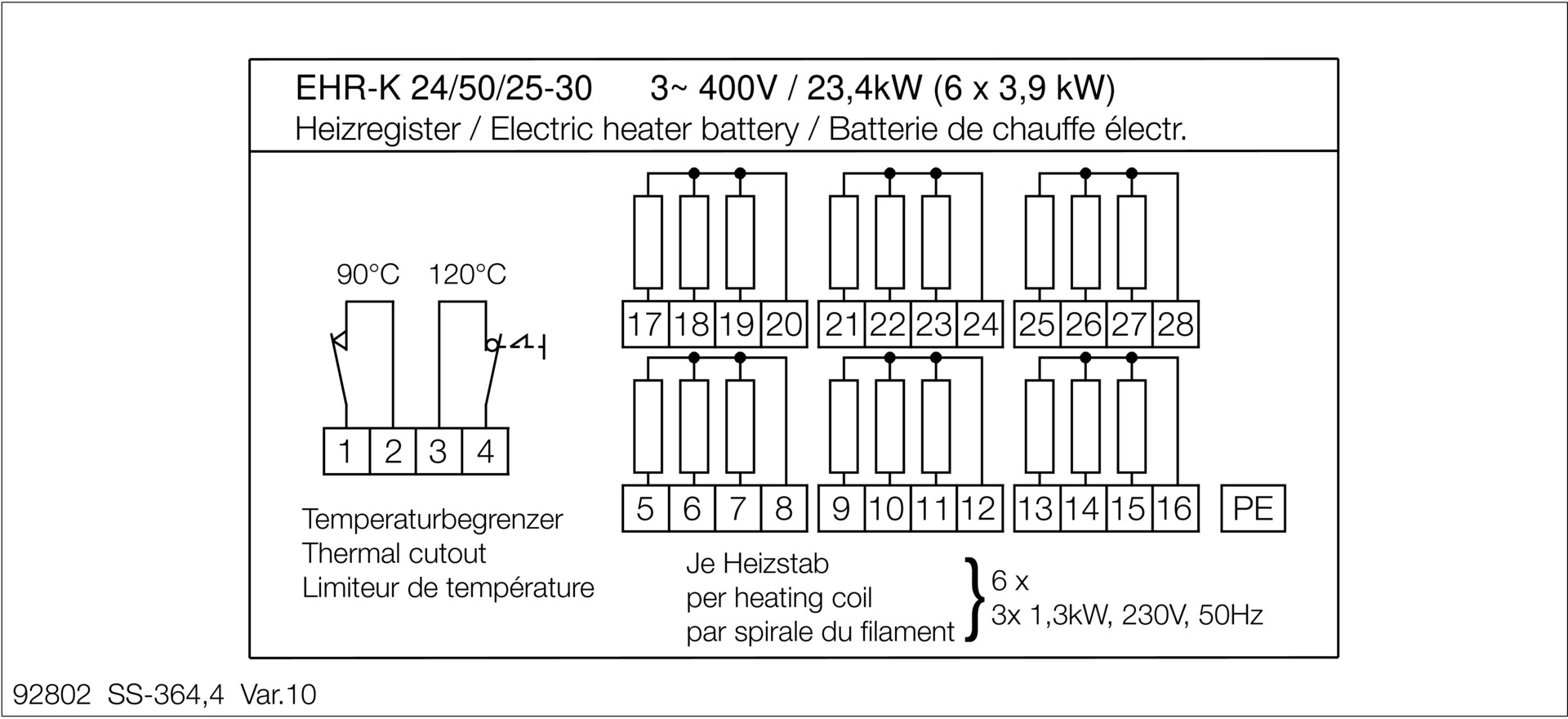geschlossener Rohrheizkörper in verzinktem Stahlblechgehäuse mit beidseitigen Anschlussflanschen für Einbau in Kanalverlauf, Rohrheizkörper mit niedriger Oberflächentemperatur auf außenliegenden Anschlusskasten verdrahtet (in mehreren Gruppen schaltbar), ausgerüstet mit einem selbstständig rückstellenden Temperaturbegrenzer (Auslösetemperatur 90 °C) und einem manuell rückstellbaren Temperaturbegrenzer (Auslösetemperatur 120 °C)
