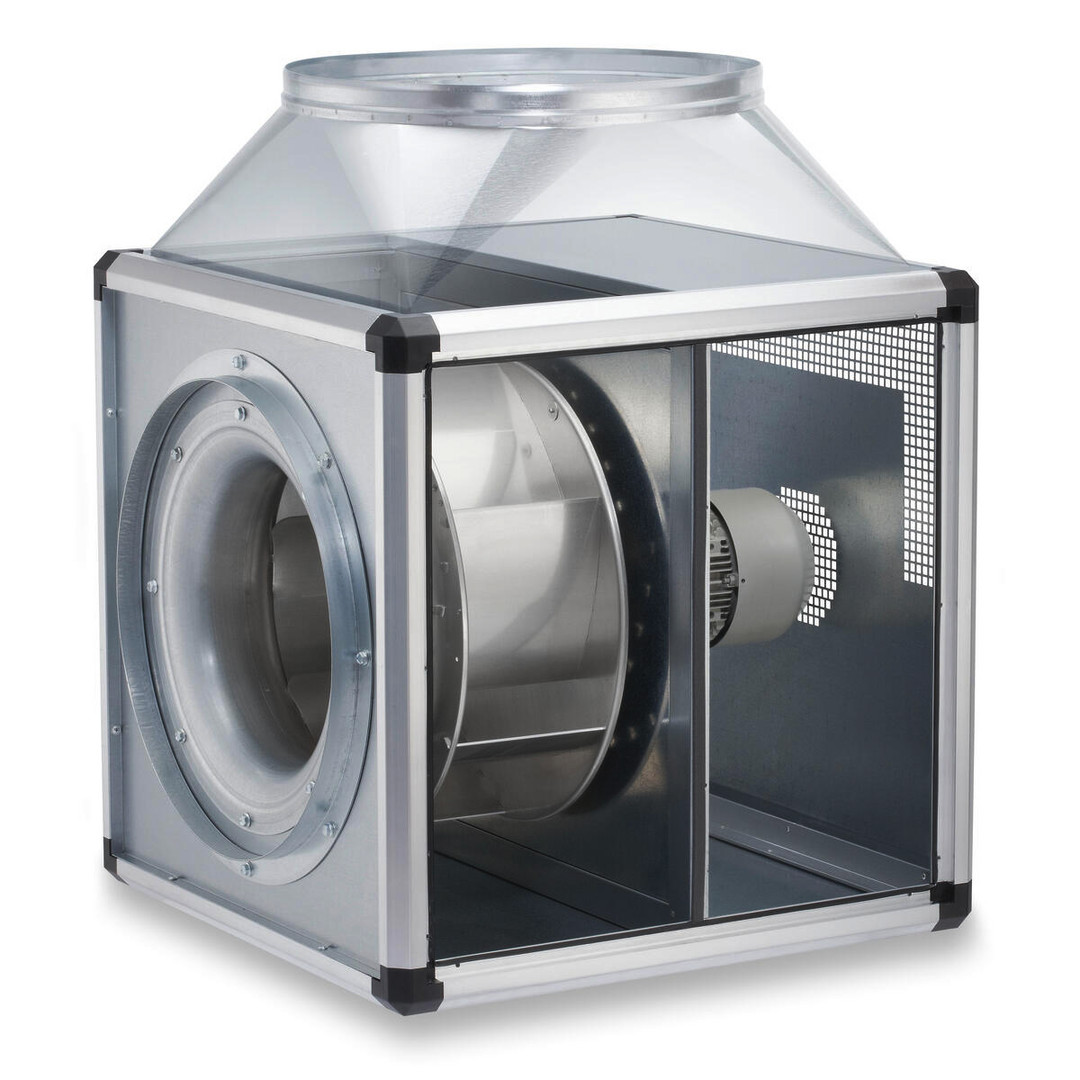 selbsttragende Rahmenkonstruktion aus Aluminium-Hohlprofilen, 20 mm doppelwandige starke Seitenpaneele aus verzinktem Stahlblech, schall- und wärmeisoliert durch Auskleidung mit nicht brennbarer Mineralwolle, saugseitig mit Düse für Einströmung sowie Stutzen und flexibler Manschette zum Anschluss an Rohre, druckseitig mit Formstück (quadratisch auf rund) für verlustarme Ausströmung und flexibler Manschette zur Unterbindung von Körperschallübertragung, freilaufendes Radial-Hochleistungslaufrad mit rückwärts gekrümmten Kunststoff-Schaufeln auf verzinkter Stahlscheibe (bei GB T120 Aluminium-Laufräder) direkt angetrieben, Antrieb durch wartungsfreien und drehzahlsteuerbaren Außenläufer- bzw. IEC-Normmotor in Schutzart IP 54 (kugelgelagert, funkstörungsfrei), serienmäßiger Klemmenkasten, Baureihe BT T120 zur Förderung von verschmutzter und heißer Luft bis max. 120 °C