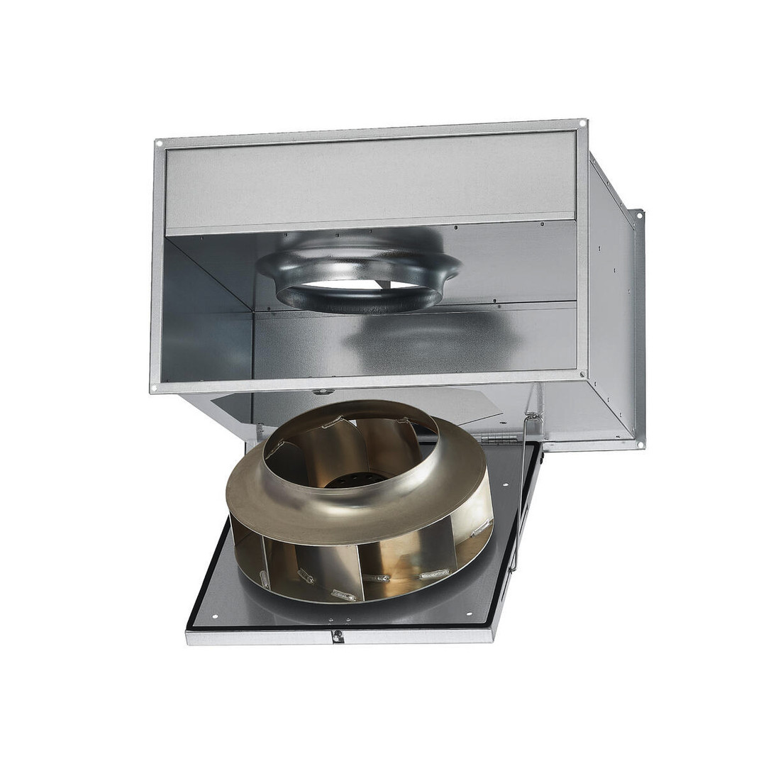 hocheffizienter EC-Motor, druck- und volumenstarker Radialventilator mit hohem Wirkungsgrad, ausschwenkbare Motor-Laufrad-Einheit, zur Förderung von verschmutzter Luft prädestiniert, geradlinige Durchströmung, kompakte Bauweise, Gehäuse aus verzinktem Stahlblech (beidseitig mit Kanal-Flanschprofilen (20 mm) zum Einbau in den Kanalverlauf, Laufrad radial (mit rückwärts gekrümmten Schaufeln aus Kunststoff), Antrieb drehzahlsteuerbarer EC-Außenläufermotor in Schutzart IP54 (wartungs- und funkstörungsfrei, kugelgelagert, Motor und Laufrad dynamisch ausgewuchtet), Motorschutz Integrierte elektronische Temperaturüberwachung für EC-Motor und Elektronik, stufenlose Drehzahlsteuerung mit Potentiometer oder stufenlose Drehzahlregelung mit Universal-Regelsystem, elektrischer Anschluss Klemmenkasten (IP54) an ausgeführtem Kabel montiert, Einbau in jeder Lage möglich