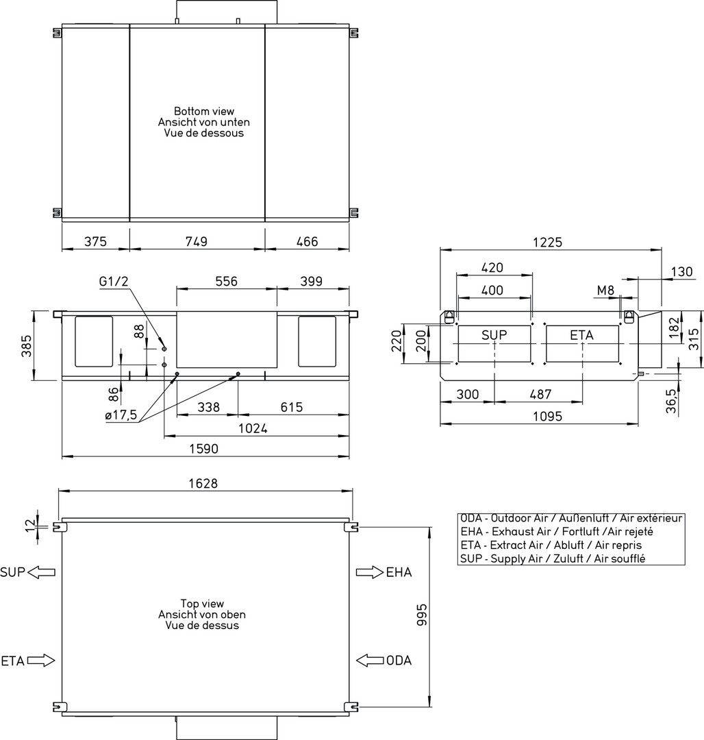 mit Kreuzgegenstrom-Wärmetauscher mit Regelung fertig verdrahtet, zur Montage an der Geschossdecke oder in der Zwischendecke in Innenräumen, eingebautes elektrsches Vorheizregister zur Frostsicherung des Wärmetauschers bei sehr niedrigen Außenlufttemperaturen, bei erhöhtem Komforttemperaturbedarf kann optional ein Elektro- oder Warmwasser-Nachheizregister in das Gerätegehäuse eingebaut werden, Gehäuse bestehend aus Aluzink-Blech, isoliert mit 50 mm Mineralwolle zur optimalen Wärme- und Schalldämmung, Außen allseitig korrosionsbeständig beschichtet, RAL 7047, Korrosion Klasse C4, innen verzinkt, Revisionsöffnungen auf der Geräteunterseite für einfachen Zugang und optimaler Reinigungs- und Wartungsmöglichkeit, zusätzliche Revisionsöffnung seitlich für die Filterwartung, 2 Kondensatanschlüsse DN 17,5 mm: 1 x Fortluftseite, 1 x Zuluftseite, Kondensatwanne aus Edelstahl mit integriertem Gefälle, automatische Bypassklappe zur freien Kühlung aktivierbar, Temperaturfühler für Außenluft, Zuluft, Abluft und im Wärmetauscher zur ganzheitlichen Überwachung des Betriebszustandes, Wärmerückgewinnung mittels hocheffizienten Gegenstromwärmeübertrager aus Aluminium, Wärmerückgewinnung nach EN308 bis zu 90%, Ventilatoren: 2 direktangetriebene EC- Motoren, Klasse IE4 mit sehr niedrigen SFP-Werten, dynamisch gewuchtet und schwingungsgedämpft im Gerät gelagert, Stufenlos steuerbar über 0-10V Signal, Steckverbindungen an allen elektrischen Bauteilen zur Vereinfachung von Wartungsarbeiten, Filter: 2 großflächige, druckverlustoptimierte Kassettenfilter serienmäßig eingebaut (Außenluft ePM1 55% (F7) und Abluft ePM10 50% (M5)), Einsatz bis Filterklasse ePM1 80% (F9) in der Außenluft und ePM1 55% (F7) in der Abluft optional möglich, Filterüberwachung mittels dynamischer, volumenstromabhängiger Drucküberwachung, Regelung: Das Lüftungsgerät wird mit einer vielseitigen Regelung betriebsbereit ausgeliefert, es stehen wahlweise 2 Bedienelemente (ECO und Touch) zur Verfügung (erforderliches Zubehör). Regelungsfunktionen: Lüftungsmodi Volumen- konstant CAV, Druckkonstant VAV (Zubehör erforderlich), Drehzahlkonstant CRPM in % oder über Wochenprogramm, Automatischer Lüftungsbetrieb/ Ventilation-On-Demand (VOD) mittels Feuchte, CO2 oder VOC Sensoren, bis zu 18 Sensoren pro Lüftungsgerät anschließbar, freie Kühlung, aktive Kühlung mittels Kühlregister (Kaltwasser oder DX), Temperatur-Regelung, z.B. Konstante Zuluft, außentemperaturgeführte Zuluft, Raum-Zuluft-Kaskade, etc. möglich, digitale Eingänge für Feueralarm und externen Schalter (Ein/Aus), digitaler Ausgang für Sammelstörmeldung, externe Ventilator-Ansteuerung über zwei analoge 0-10V Eingänge (Zuluft- und Abluftventilator separat), Anbindung an die GLT über BACnet IP, oder MODBUS TCP möglich, Inbetriebnahme- Assistenten zur einfachen und schnellen Inbetriebnahme des Geräts sowie des passenden Zubehörs, Technische Daten: Max. Volumen: 570 m3/h bei 200 Pa ext. Nennstrom mit Vorheiz.: 17,2 A, Spannung/Frequenz: 230 V, 50 Hz, Elektrische Vorheizung: 1,6 kW, Temp. Arbeitsbereich: - 20 GradC bis +50 GradC, Aufstelltemp.: 0 GradC bis +50 GradC, Maße: 1578 x 1050 x 383 (L x B x H) mm, Kanalanschluss: 300 x 150 mm, Gewicht (Gerät): 130 kg, Liefereinheit: 1-teilig