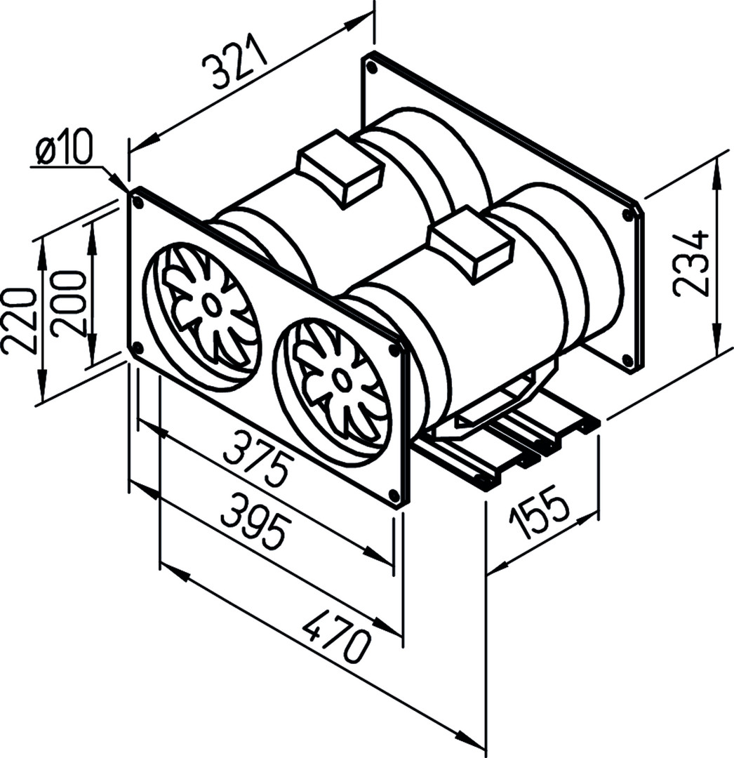 speziell für direktes Zwischensetzen in Rohrsysteme, Anwendungen im Gewerbe-/Industrie- und Wohnbereich, Ansaug- und Ausblasstutzen entsprechen den Norm-Rohr-Ø, serienmäßig mit 2 Leistungsstufen (100%ig drehzahlsteuerbar), Montage in jeder Lage, Longlife-Kugellager (ausgelegt für 30000 Betriebsstunden), herausnehmbare Ventilatoreinheit mit Klemmenkasten in jede Position drehbar, integrierte Montagekonsole, Gehäuse aus schlag- und korrosionsfestem Kunststoff in hellgrau, 2 parallel angeordnete MV Ventilatoren werden durch saug- und druckseitig aufgesetzte Kanalanschlussplatten miteinander verbunden und mit Montageschienen verschraubt (Lieferung als fertiger Bausatz), jeder Ventilator ist mit einem eigenen Klemmenkasten außen am Gehäuse ausgestattet