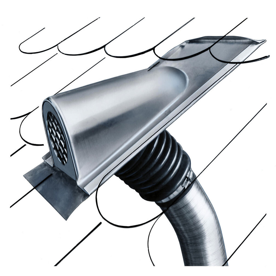für fast alle Dachziegelarten geeignet, durch Walzbleirand an verschiedene Formen anpassbar, Haube und Platte aus verzinktem Stahlblech, flexibler Kunststoff-Balg mit Stufenstutzen zum Anschluss für alle Rohr-Ø von 70-115 mm, Rohrbefestigung durch mitgelieferte Schlauchschelle